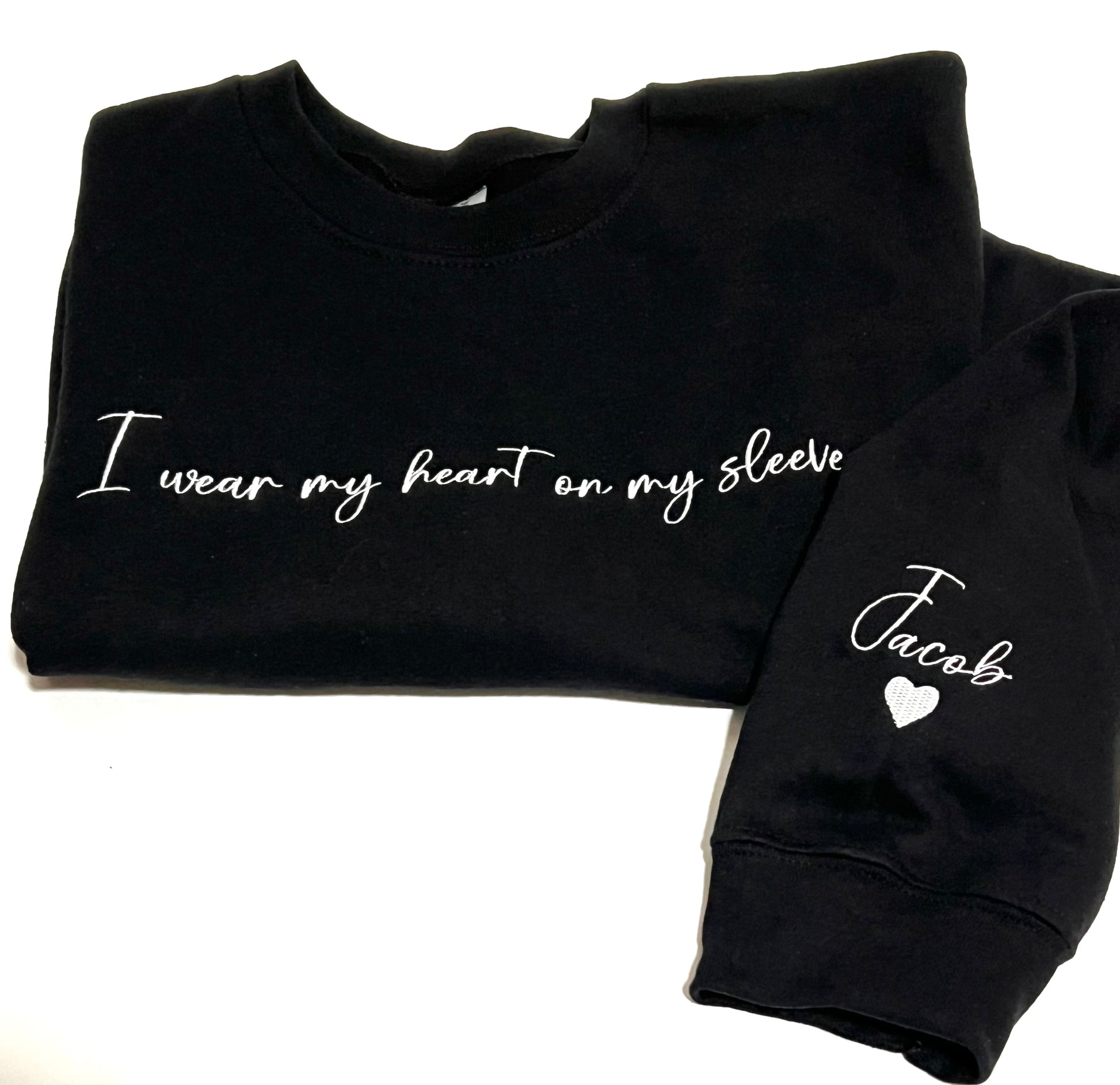 This embroidered sweatshirt proudly displays the phrase "I Wear My Heart On My Sleeve" and can be customized with a child's name or anyone you hold dear. Stay cozy with the fleece-lined interior. Show your love in style.
