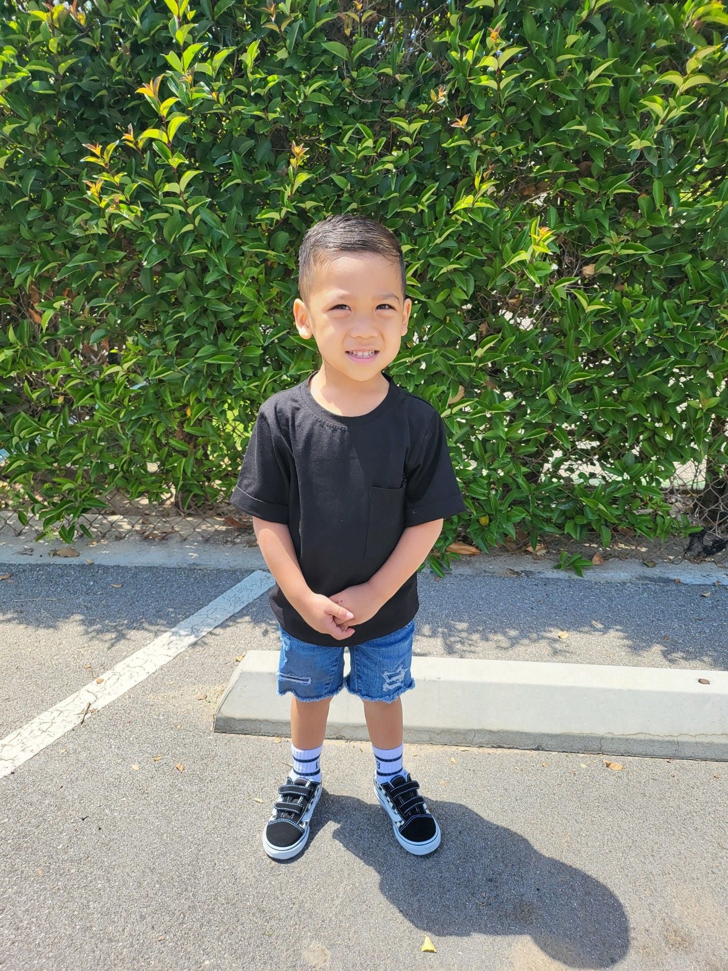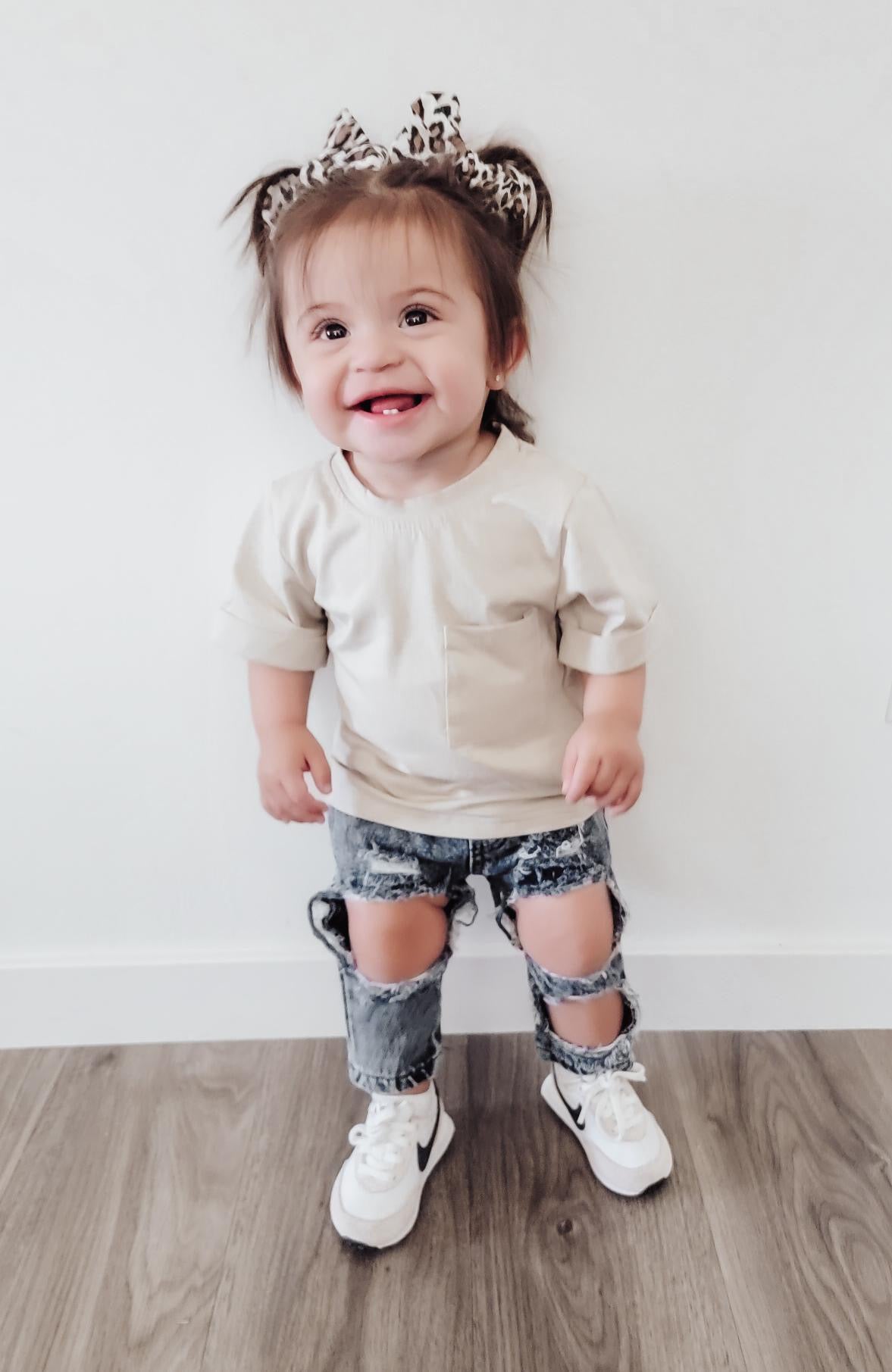 The Malachi tee is a t-shirt with a short cuffed sleeve. The back portion is longer for coverage and has a pocket on the upper left for small items. It is an ideal basic tee for your little one's wardrobe and can be easily paired with bottoms.