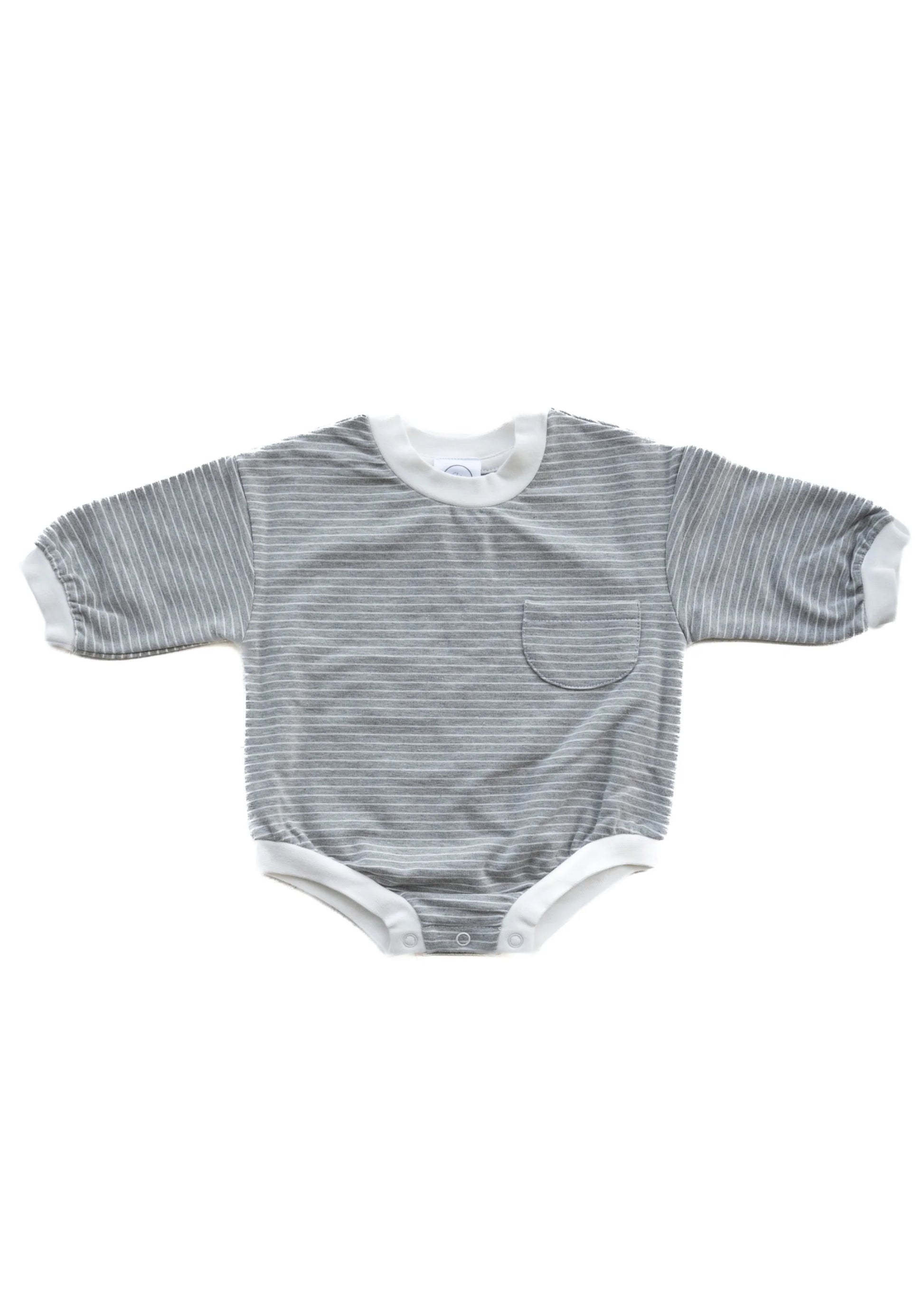 The Devin Stripe Romper is the perfect choice for your little one. Made of a lightweight grey and white stripe fabric, it features crotch snaps and a convenient pocket on the left side. This romper is sure to keep your baby comfortable and stylish.